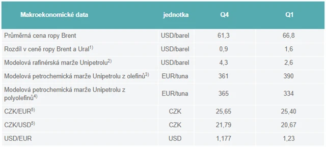 Petrochemický holding Unipetrol zveřejnil modelové marže za první čtvrtletí. V rafinérském segmentu marže klesla z 4,3 USD na barel v posledním loňském kvartálu na 2,6 USD. Rozdíl mezi cenami ropy Brent a Ural stoupl z 0,9 USD na 1,6 USD na barel. Olefinová marže dosáhla 390 eur na tunu (4Q2017: 361 eur) a polyolefinová marže byla 334 eur na tunu (4Q2017: 365 eur).