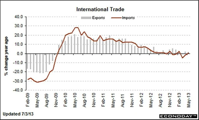 V dubnu byl deficit 40,15 miliardy dolarů. Import vzrostl o 1,9 %, export klesl o 0,3 %. Celkový objem importů se v květnu vyšplhal na 232,1 miliardy dolarů, nejvýše od března 2012.