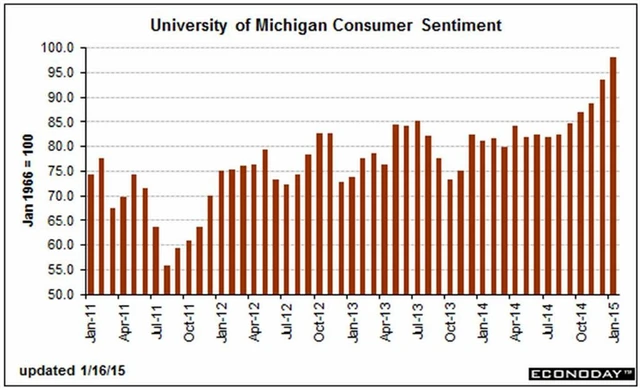 Důvěra amerických spotřebitelů v ekonomiku Spojených států se v lednu dál zvyšuje a aktuálně se pohybuje na nejvyšší úrovni od ledna 2004. Předběžný lednový index spotřebitelské důvěry Michiganské univerzity roste na 98,2 bodu z 93,6 bodu v prosinci.