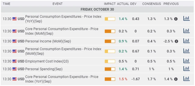 Jádrový cenový index osobní spotřeby (preferovaný inflační ukazatel Fedu, takzvaná PCE inflace) meziročně vzrostl o 1,5 % (odhad: +1,7 %, srpen revidován na +1,4 % z +1,6 %).