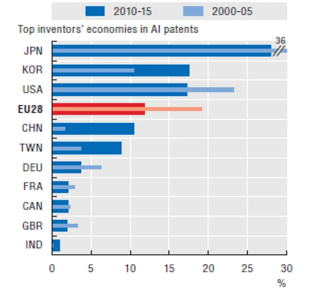 Konkrétně v sektoru umělé inteligence se nejvíce patentů přihlašuje v Japonsku, v Jižní Koreji (díky obrovskému patentovému portfoliu Samsungu) a v USA. EU i přes větší počet obyvatel za těmito státy zaostává.