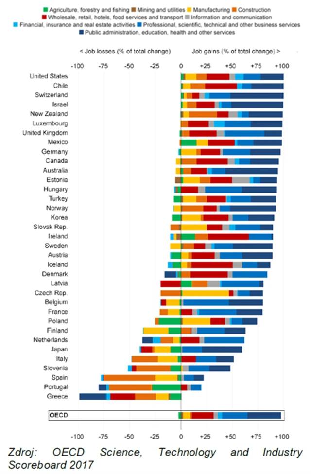 Tím nejzajímavějším na celém reportu je ovšem analýza změn v zaměstnanosti. Mezi roky 2010 a 2015 se zaměstnanost v zemích OECD celkově zvýšila (více ve státech NAFTA než v EU). Drtivá většina nových pracovních pozic vznikla ve službách (přes 90 % z 27 milionů), ve strojírenství jich přibily jen dva miliony.