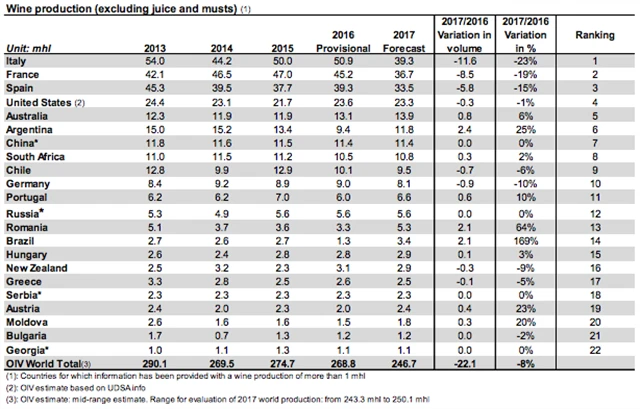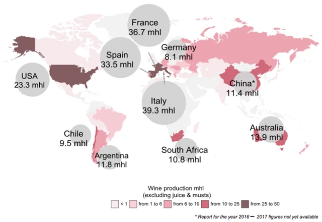 V Itálii by letos produkce vína měla klesnout o 23 %, ve Francii o 19 % a ve Španělsku o 15 %. O čtvrtinu by se naopak měla zvýšit v Argentině a o 169 % v Brazílii. Ve Spojených státech, které jsou čtvrtým největším producentem vína na světě, by se letos produkce měla meziročně snížit o procento na 23,3 milionu hektolitrů.