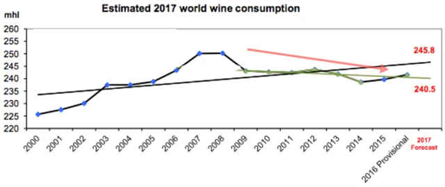 Poptávka po víně se sice nadále nachází pod vrcholem z roku 2008, v horizontu několika let je ale relativně stabilní. Pro letošní rok hovoří odhady o poptávce na úrovni 240,5-245,8 milionu hektolitrů.
