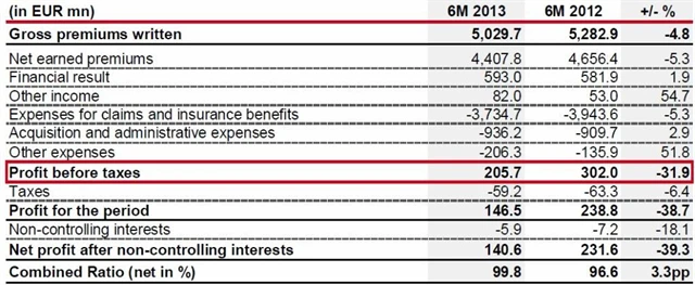 Provozní zisk vzrostl o 9,5 % na 330,7 milionu eur, čistý zisk klesl o 39,3 % na 140,6 milionu eur. Pojišťovna zaplatila 180 milionů eur jako náhrady škod způsobených povodněmi v Evropě. Pojistné nároky způsobené špatným počasím se ztrojnásobily na 230 milionů eur. Zisk před zdaněním v České republice vzrostl o 2 % na 90,2 milionu eur.