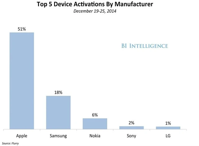 To je poměrně překvapivé,zvláště když uvážíme, že největší konkurenti se k výkonu Applu ani nepřiblížili. Za každý aktivovaný Samsung, byly aktivován tři Apply. Samsung ukousl z vánočních aktivací jen 18 %.