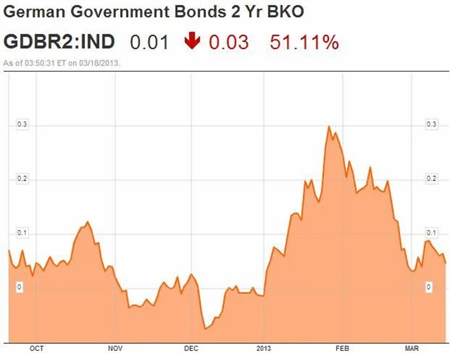 Strach se šíří z Kypru, na což pozitivně reagují takzvané bezpečné přístavy, například americký dolar, zlato (v eurech +2 %) nebo německé bondy. Aktuálně 2leté výnosy sice +0,01 %, ale ráno byly na chvíli i v záporu. 10letý bund vynáší aktuálně zhruba 1,39 %.