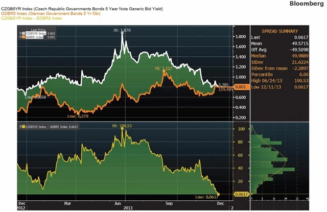 Výnosy 10letých českých dluhopisů poklesly o 3 bazické body, a zúžily tak spread k výnosům německých bondů na 39 bazických bodů. U českých credit default swapů (CDS - pojištění proti defaultu) se snížil spread o 2 bazické body na 57 bazických bodů. Je tak nejníže od června.