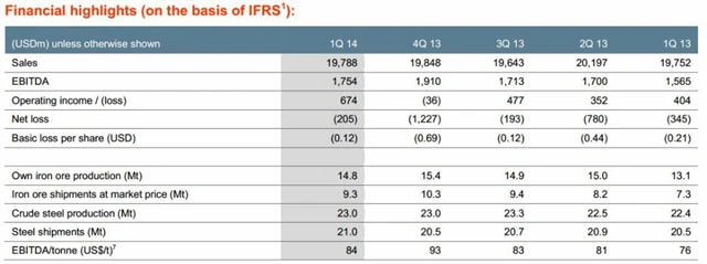 Výsledky ArcelorMittal v 1Q2014: Zisk EBITDA 1,75 miliardy USD (odhad: 1,789 miliardy USD), tržby 19,788 miliardy USD (odhad: 19,992 miliardy USD)