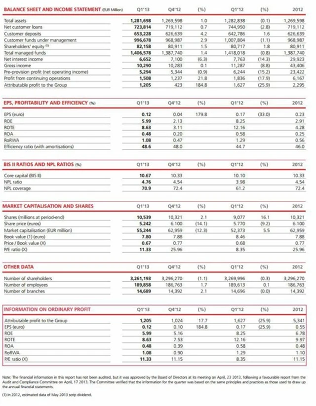 Hrubé příjmy banky se snížily o 8,8 % na 10,29 miliardy eur. Příjmy z úroků klesly o 14,3 % na 6,652 miliardy eur. Důvodem byly nižší úrokové sazby a recese na důležitých trzích. Zisk v Latinské Americe se snížil o 18 %. Region se na celkovém zisku skupiny podílí zhruba polovinou. V Británii se zisk snížil o téměř čtvrtinu.