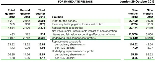 Výsledky BP ve 3Q: Čistý zisk 3,7 miliardy USD (odhad: 3,36 miliardy USD). Firma zvyšuje dividendu o 6 % na 9,5 centu