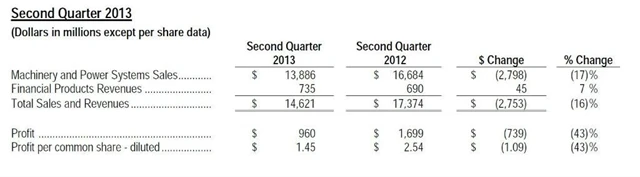 Čistý zisk klesl na 960 milionů dolarů z 1,70 miliardy USD o rok dříve. Na jednu akcii Caterpillar vydělal 1,45 dolaru, což bylo asi čtvrt dolaru pod průměrným odhadem analytiků, uvedly agentury Reuters a AP. Tržby společnosti se snížily o 16 % na 14,6 miliardy dolarů.