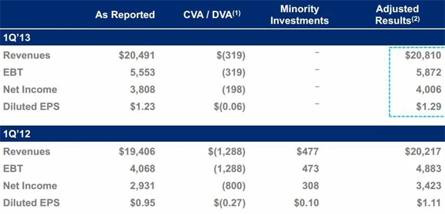 Banka v prvních třech měsících uvolnila z rezerv na ztrátové úvěry 652 milionů dolarů. Příjmy v divizi investičního bankovnictví a obchodování s cennými papíry se zvýšily o 31 % na 6,98 miliardy USD.