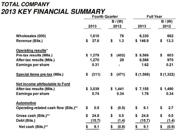Hospodářské výsledky byly podpořeny vyššími zisky na severoamerickém trhu, které kompenzovaly ztráty v Evropě a Jižní Americe. Čtvrtletní tržby stouply o čtyři procenta na 37,6 miliardy dolarů. Výsledky překonaly očekávání analytiků a akcie automobilky po jejich zveřejnění posílily o více než tři procenta.