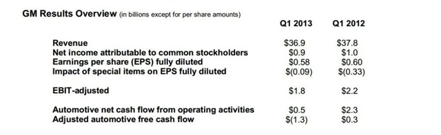 Čistý zisk největší americké automobilky General Motors v letošním prvním čtvrtletí klesl na 865 milionů dolarů ze zhruba miliardy dolarů před rokem. Navzdory poklesu je však lepší výsledek, než se čekalo. Celkové tržby se meziročně snížily o 2,4 % na 36,9 miliardy dolarů.