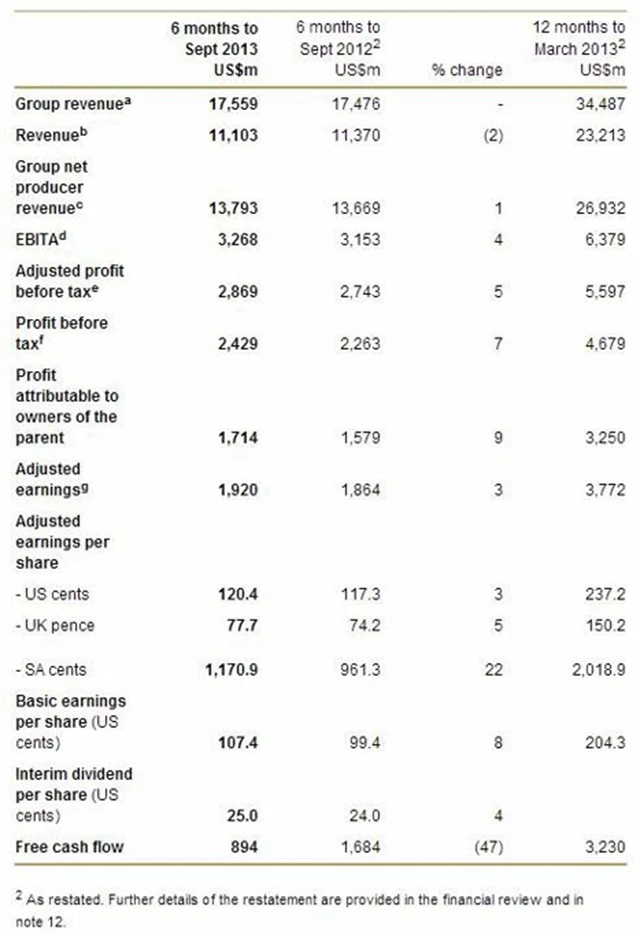 Za šest měsíců do 30. září 2013 vykázala druhá největší pivovarská skupina na světě zisk před zdaněním 2,429 milionu USD, šlo tedy meziročně o 7% růst. Analytici očekávali růst jen 6 %. Stály za tím hlavně lepší zisky z Latinské Ameriky, Afriky a regionu Asie a Pacifiku.