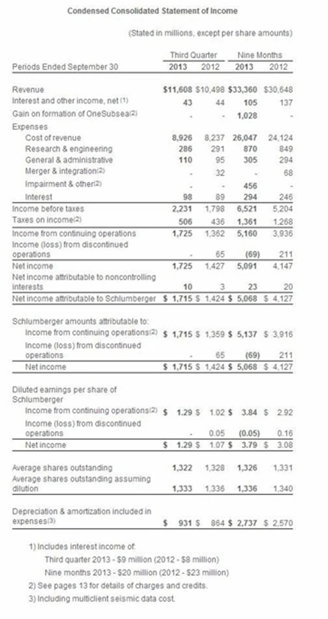 Výsledky Schlumberger ve 3Q2013: Zisk na akcii 1,29 USD (odhad: 1,24 USD), tržby: 11,608 miliardy USD (odhad: 11,584 miliardy USD)