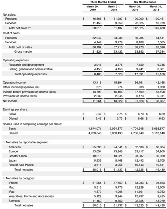 Celkové tržby společnosti v druhém finančním čtvrtletí, které skončilo 30. března, meziročně klesly o 5 % na 58,02 miliardy dolarů. Analytici čekali podle ankety agentury Refinitiv pokles tržeb na 57,37 miliardy dolarů. V nynějším finančním čtvrtletí očekává Apple tržby 52,5 až 54,5 miliardy dolarů, zatímco analytici je odhadují pouze na 51,93 miliardy dolarů.