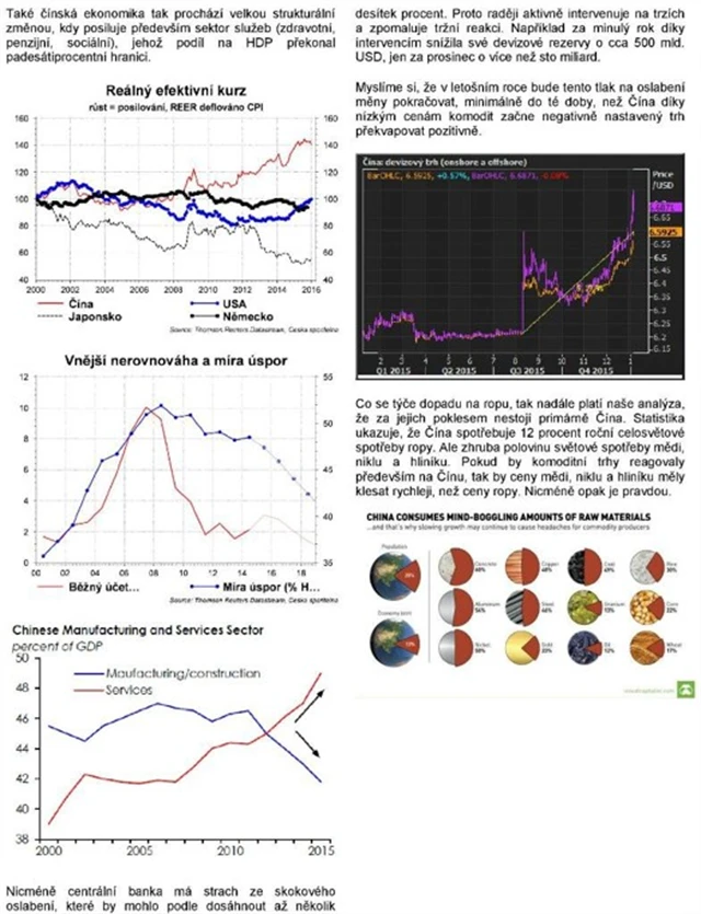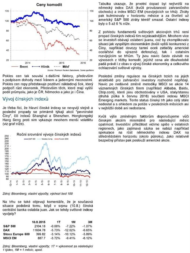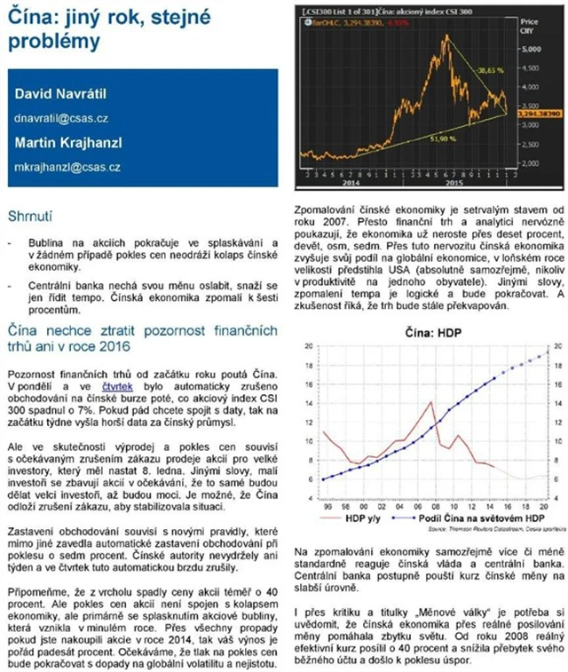 Bublina na trhu s čínskými akciemi dále splaskává, pokles cen ale ani v nejmenším neodpovídá stavu čínské ekonomiky. Očekáváme, že čínská centrální banka nechá oslabit jüan, pouze se bude nadále snažit řídit tempo poklesu. Růst ekonomiky zpomalí k 6 % za rok.