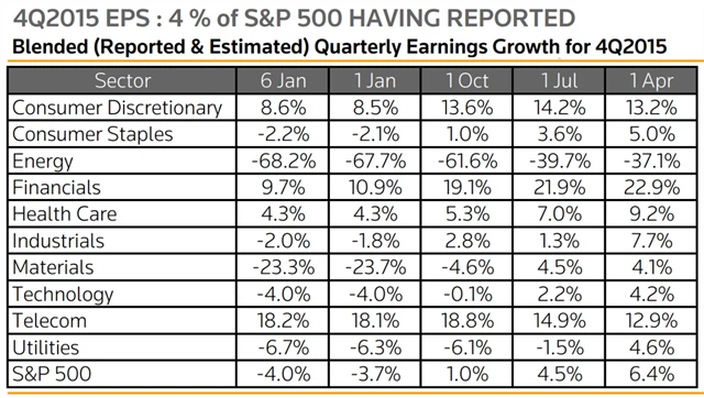 Analytici oslovení agenturou Thomson Reuters od dubna 2015 očekávali více než 5% tempo růstu zisků amerických firem ve čtvrtém čtvrtletí 2015, postupně je ale revidovali níže na jednociferné míry, až se svými odhady začátkem léta klesli do mínusu. Na začátku ledna počítali již s poklesem zisků za 4Q2015 o 4 %, přestože se i v minulé výsledkové sezóně potvrdilo, že původně velmi pesimistické odhady nebyly úplně namístě (analytici na počátku výsledkové sezóny za 3Q2015 předpovídali pokles zisků amerických firem o více než 4 %, nakonec se ale zisky snížily jen o 0,8 %, což bylo vzhledem k velmi negativnímu příspěvku sektoru energetiky překvapením).