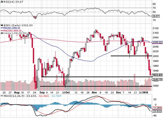 "Lepší vstup do roku 2016 si snad tradeři ani nemohli přát. Index S&P 500 v prvním týdnu odepsal 5,96 %, zažil volný pád a navázal na konec prosince 2015. Krátkodobá opačná reakce může přijít kdykoli, ale vyznění grafu se změní na pozitivní až ve chvíli, kdy se cena vrátí nad 2 080. Nejbližší hladina podpory je okolo 1 920, další na 1 880. Předchozí support 2 000 se změnil na nejbližší rezistenci. Index volatility VIX vyskočil za týden o 48 % a je na říjnových a prosincových maximech," napsal v pravidelném technickém komentáři pro Investiční web opční obchodník Josef Košťál. "Rok 2016 začal ve stejném duchu jako rok 2015, ale s mnohem větší razancí. Další výhled je nejasný, ale předpokládám, že druhá polovina ledna bude příznivější. Zda se výprodeje změní v paniku, ukáže příští týden. Komentáře jsou všeobecně hodně negativní a přilévají olej do ohně."