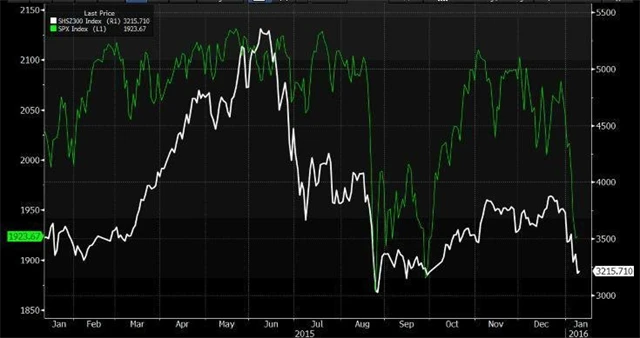 Hned v prvním obchodním dnu roku čínský akciový trh s blue chips — sledovaný indexem CSI 300 — klesl o 7 %. Podle agentury Bloomberg výprodeje ten den umazaly z hodnoty čínských akcií 590 miliard USD. Propad byl tak prudký, že spustil ochranný mechanismus, který při propadu o 7 % pozastavil obchodování na zbytek dne. Šlo o nejhorší obchodní den za poslední 4 měsíce.