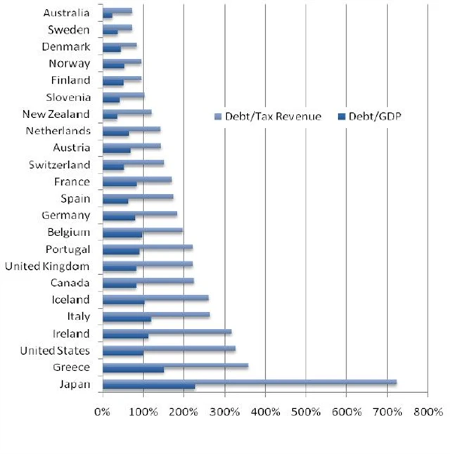 Tabulce suverénně "vévodí" Japonsko, jehož dluhy přesahují sedminásobek ročních daňových příjmů.