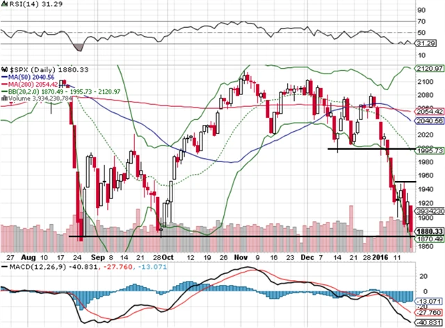 "V úvodu uplynulého týdne se zdálo, že u indexu S&P 500 přichází zklidnění. Středa a pátek ukázaly, jak plané to byly naděje. Hladiny podpory na 1 920 a 1 880 se zrovna moc neosvědčily, index testuje minima ze srpna a září 2015 okolo 1 870. Mělo by jít o silný support, pokud ale dojde k jeho proražení, další je v pásmu 1 820 až 1 800. Trhy jsou přeprodané, a proto posun vzhůru může být rychlý, ale spíše krátkodobý. Například čtvrteční rally o procento a půl byla zapomenuta s páteční otevírací cenou," píše v pravidelném technickém komentáři pro Investiční web opční obchodník a zakladatel serveru Optionslock.cz Josef Košťál. "V případě dalšího sestupu ze současných hodnot chybí indexu S&P 500 k hladině 1 820 bodů už jen 3 %. Další výhled je nejasný, ale lze očekávat, že druhá polovina ledna bude příznivější než ta první."