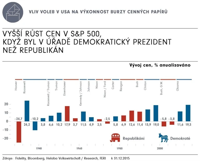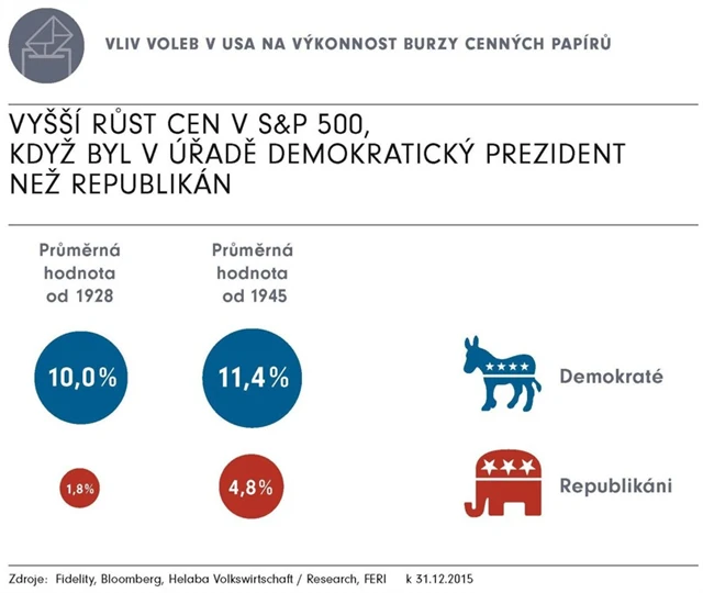 "Zatímco za vlády demokratického prezidenta vzrostly akciové trhy v průměru za rok o 10 %, během funkčního období republikánských prezidentů trhy vzrostly jen o 1,8 % ročně. Od konce druhé světové války až do současnosti pak ceny akcií vzrostly o 11,4 % za rok v průběhu vlády demokratického prezidenta, republikány vedená období vykázala roční růst v průměru jen o 4,8 %," shrnuje Adam Lessing, ředitel Fidelity International pro Rakousko a východní Evropu.