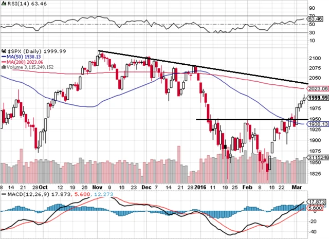 "Úterní posun indexu S&P 500 nad 1 950 dokončil na denním grafu formaci W. Situace tak nyní připomíná říjen 2015. Intradenně se index v pátek podíval i výrazně nad 2 000. Všeobecně se očekává další růst, ovšem ke klesající trendové linii a 200dennímu průměru chybí jen 1,5 %. Návrat k 1 950 by proto investory neměl překvapit," napsal v pravidelném technickém komentáři pro Investiční web opční obchodník Josef Košťál. "K uzavření cenového odskoku prvního lednového obchodního dne chybějí 2 %. Tam někam index nyní míří. Pokles a otestování hladiny 1 950 napoví více. Objevila se zpráva, že Marc Faber, notorický extrémní medvěd, se krátkodobě přiklání na býčí stranu, pokud jde o akcie. První, co mě napadlo, bylo: Pozor, katastrofa je za dveřmi!"