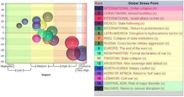 Podle studie společnosti Oxford Analytica existují další hrozby. Analytici je seřadili podle intenzity dopadu na svět. Většina těchto "vykřičníků" má geopolitický charakter, jiné by mohly být snadno spouštěči další finanční krize.