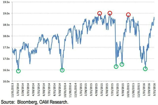 Tím signálem, který je podle Stoltzfuse nejlepší pro "časovače trhu", je 12měsíční klouzavý ukazatel P/E, v tomto případě pro index S&P 500. Stoltzfus s tímto signálem přišel již v únoru, kdy na jeho základě radil spekulantům nakupovat. Vývoj na trhu mu od té doby dal za pravdu. Nyní naopak na základě stejného indikátoru přichází s doporučením prodávat.