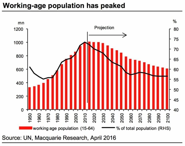 "Počet lidí v produktivním věku dosáhl vrcholu a nyní bude klesat, což se nutně musí projevit i na dlouhodobém vývoji čínské ekonomiky," upozorňuje v jedné ze svých predikcí analytický tým z Macquarie vedený Larrym Huem.