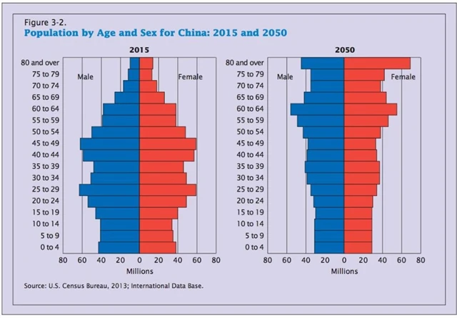 Současně se navíc čeká rychlé stárnutí čínské populace. Americký statistický úřad nedávno v analýze fenoménu stárnutí světové populace upozornil, že loni překročil počet Číňanů nad 65 let věku (136,9 milionu) počet starých lidí v Japonsku (126,9 milionu), a varoval, že do roku 2030 bude počet Číňanů starších 65 let (238,8 milionu) vyšší než součet počtu obyvatel všech věkových skupin v Japonsku a Egyptě (231,8 milionu), a do roku 2050 (348,8 milionu) dokonce převýší souhrnný počet obyvatel Japonska, Egypta, Německa a Austrálie.