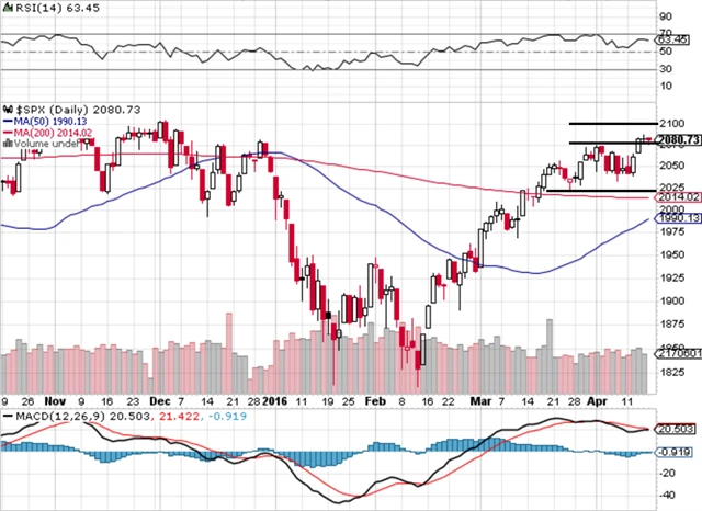 "K historickým cenovým maximům schází v USA relativně malý krok. Graf indexu S&P 500 je ve srovnání s předchozím týdnem pozitivnější, ale jasný směr aktuálně chybí. Stagnace a čekání na průlom rezistence – to je charakteristika současné nálady," napsal v pravidelném technickém komentáři pro Investiční web opční obchodník Josef Košťál. "Index S&P 500 se přiblížil na dohled k hodnotě ze začátku loňského prosince a k historickým maximům. V druhé polovině dubna se naplno rozběhne výsledková sezóna. Prognózy analytiků jsou spíše negativní, ale již uplynulý týden ukázal, že očekávání jsou nastavena 'správně'. Převažující optimismus by mohl být ochlazen případným poklesem pod 2 040."