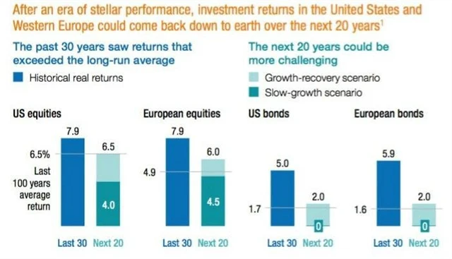 Společnost McKinsey Global Institute (MGI) provedla průzkum, v němž se pokusila odhadnout výkonost akciových trhů v následujících 20 letech, a to ve dvou scénářích. A zdá se, že ani v tom lepším případě nelze očekávat výnosy, na jaké si investoři zvykli v posledních třiceti letech.