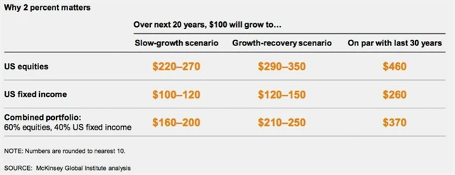 "Je poměrně překvapující, že i při rychlejším růstu HDP budou výnosy akcií a dluhopisů v následujících letech nižší," řekla Susan Lund, jedna z autorek zprávy. I relativně malé rozdíly pak v delším horizontu mohou znamenat velkou změnu v celkových výnosech.