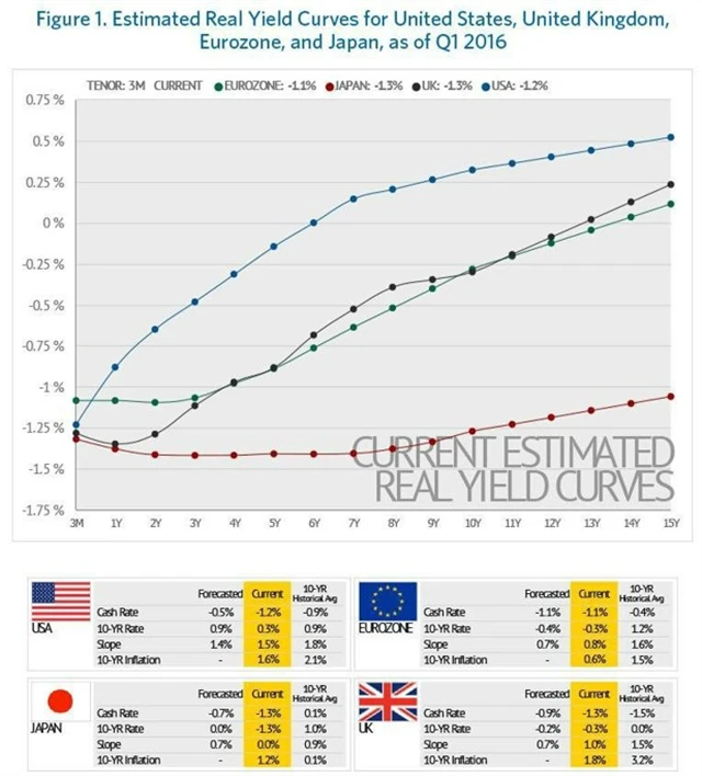 Nijak výjimečné dnes nejsou dluhopisy se zápornými výnosy. Ve Spojených státech jsou reálné záporné výnosy (nominální výnosy ponížené o inflaci) skutečností u vládních dluhopisů se splatností do zhruba pěti let, ve Spojeném království u bondů s maturitou až do zhruba 13 let a v Japonsku zůstává výnosová křivka pod nulou v ještě výrazně delším horizontu.