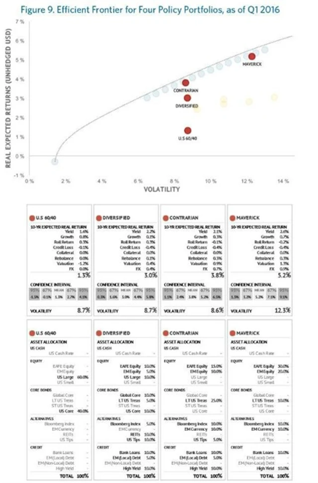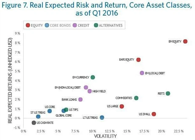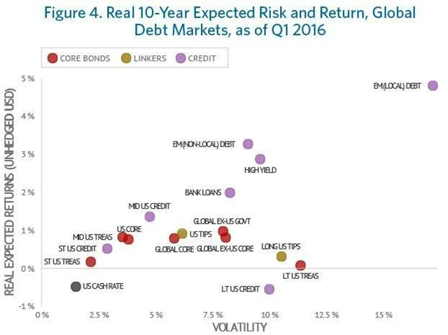 Důsledky záporných úrokových sazeb tak zásadním způsobem nabourávají zavedené strategie založené na diverzifikaci portfolia prostřednictvím různých tříd aktiv. Jak ukazuje následující graf, velká část bondů v současném prostředí z pohledu výnosů patří k nejméně atraktivním investičním nástrojům. Očekávaný roční reálný výnos z držení amerických vládních dluhopisů se nyní v závislosti na jejich maturitě pohybuje v desetiletém horizontu mezi -1 a +1 %.