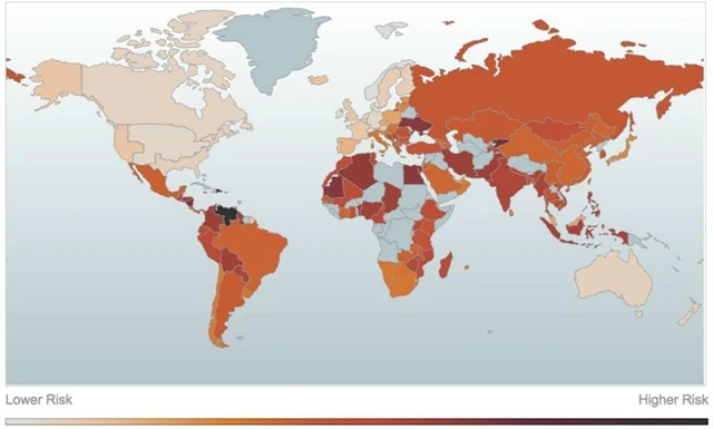 Globální pojišťovnická skupina FM Global seřadila 130 zemí podle toho, jak jsou jejich dodavatelské řetězce odolné vůči otřesům způsobeným levnou ropou, terorismem a přírodními katastrofami. Na mapě to je zobrazeno jasně - čím temnější červená, tím rizikovější země.