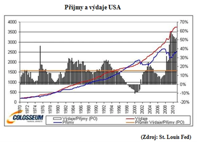 Od roku 1950 do roku 2007 vzrostl dluh Spojených států z 0,25 bilionu dolarů na 9 bilionů. S příchodem finanční krize se pak zvýšil během pouhých 3 let o 4,5 bilionu dolarů na 93,2 procenta HDP. Problém se navíc dále zhoršuje. Nejlépe o celé situaci vypovídá graf, kde jsou znázorněny příjmy a výdaje USA.