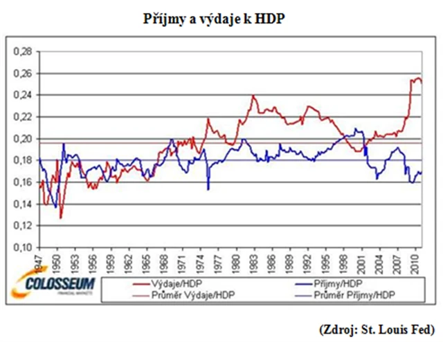 Zajímavý je i pohled na příjmy a výdaje v poměru k HDP. Od roku 1947 jsou průměrné výdaje k HDP na úrovni 19,6 %. V případě příjmů k HDP se průměrná hodnota pohybuje na 18 %. Z historického pohledu Spojené státy za posledních více jak 60 let utrácejí více, než získají z daní. V posledních dvou letech se situace zhoršila a oba poměry se výrazně vychýlily od průměrných hodnot, přičemž o poznání dramatičtější je situace v případě výdajů k HDP.