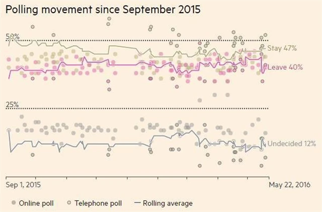 Stále více se budou investoři soustředit také na blížící se hlasování o vystoupení Spojeného království z Evropské unie, které je naplánované na 23. června. Podle listu Financial Times, který agreguje výsledky předvolebních průzkumů, nyní mírně převažují zastánci setrvání země v evropském společenství (47 %) nad odpůrci EU (40 %).