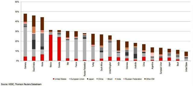 Z nejrozvinutějších zemí jsou na exportech do Číny závislé zejména Jižní Korea a Austrálie, u nichž může mít změna orientace hospodářské politiky Pekingu poměrně velký vliv na ekonomiku. V případě Koreje, u níž bezmála 14 % HDP tvoří exporty do Číny, to může znamenat 0,2-1,8 procentního bodu růstu HDP (což platí oběma směry).