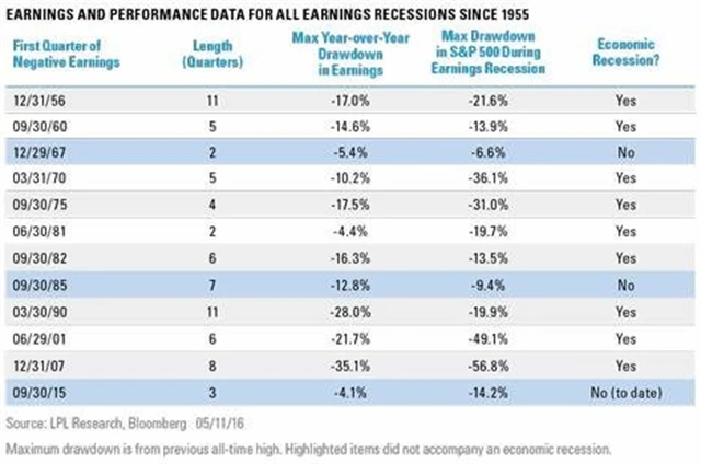 Ziskovou recesi, která nebyla doprovázena poklesem HDP, investoři vedle té současné zažili od roku 1955 ještě v letech 1967-1968 (2 čtvrtletí poklesu zisků) a 1985-1986 (7 čtvrtletí poklesu zisků). Pokles cen ropy byl přitom stejně jako v současnosti na vině také v letech 1985-1986.