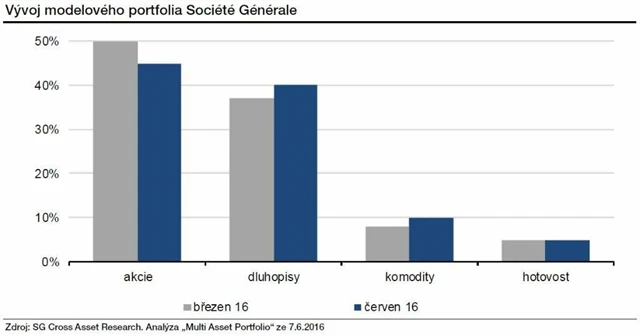 "Poté, co od poloviny února vzrostly ceny akcií, je Société Générale akciovým investicím nakloněna méně než před čtvrt rokem. Váha akcií v portfoliu by podle ní měla být 45 % oproti dosavadním 50 %. Mírně naopak vzrostla doporučovaná váha dluhopisů (zejména státních emitovaných Japonskem a rozvíjejícími se zeměmi) a také komodit, především těch energetických," shrnuje aktualizaci modelového portfolia stratégů Société Générale Josef Němý, analytik z dceřiné Komerční banky.