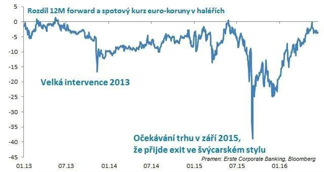 Červen 2016 si pak asi těžko budeme pamatovat jako bod zlomu spotového kurzu EUR/CZK, může však být bodem zlomu na trhu s forwardy. Ty se od prosince přibližovaly spotovému kurzu. O překážku méně na cestě ČNB k takzvanému exitu (ukončení kurzového závazku na 27 EUR/CZK) může být impulzem k prodejům eur a nákupům korun "na forward" nejen pro zajišťující se exportéry, ale také pro fondy k dobudování sázek na posílení koruny.