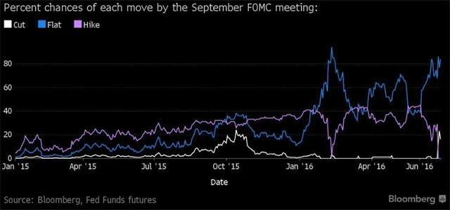 Šance na další zvyšování úrokových sazeb ze strany Fedu jsou nyní minimální. Ve skutečnosti je pravděpodobnost snížení sazeb vnímána jako větší než možnost dalšího utahování měnové politiky. "Brexit vystavil Fedu stopku," myslí si Tony Dwyer, akciový stratég ze společnosti Canaccord Genuity. "Nepochybujeme o tom, že brexit bude znamenat odložení červencového a srpnového zvyšování sazeb. Jde vlastně o faktor, který spíše vybízí k uvolnění politiky," doplnil Dwyer.