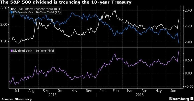 Výnosy 10letých státních dluhopisů USA se po britském referendu propadly na tříletá minima kolem 1,44 %, postupně spadly ještě níže. Jelikož investoři stále hledají pravidelný příjem a index S&P 500 jim nabízí dividendový výnos výrazně přes 2 %, je jasné, která z možností u řady hráčů na trhu vyhraje.