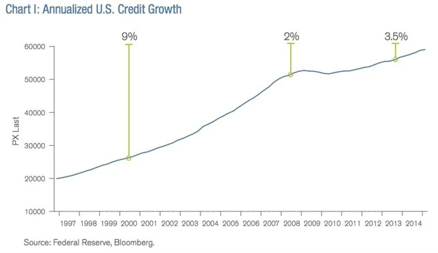 "Zatímco kredit v USA rostl na začátku století o zhruba 9 % ročně, v posledních kvartálech se růst sotva pohybuje okolo 4 %," pokračuje Bill Gross. "To nestačí. Vysoce zadlužený ekonomický systém potřebuje nové úvěry pro svou stabilitu a udržitelnost. Kredit je olej v motoru, takže když privátní sektor (ne centrální banky) negeneruje dostatečný růst úvěrů, systém se zadře."